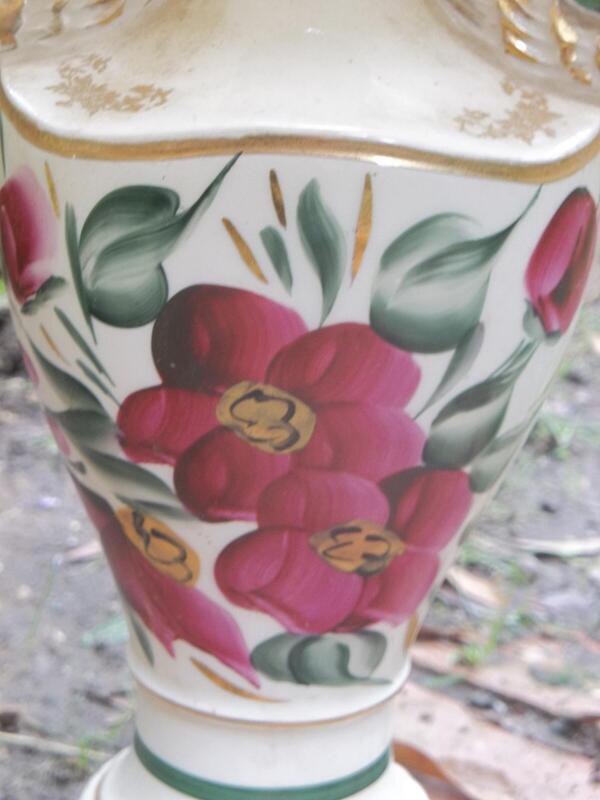 message pekewanted about this ad work but probably need rewiring. dusty . owned by my 94 yr old mom for decades. ceramic with hand painted floral tole design. ivory red and green with gold. approx 20 inches tall . includes shades . everything needs cleaning. local Contactless porch pick up. $25 for the pair . put cash under doormat Location Lanham Maryland close to the beltway |