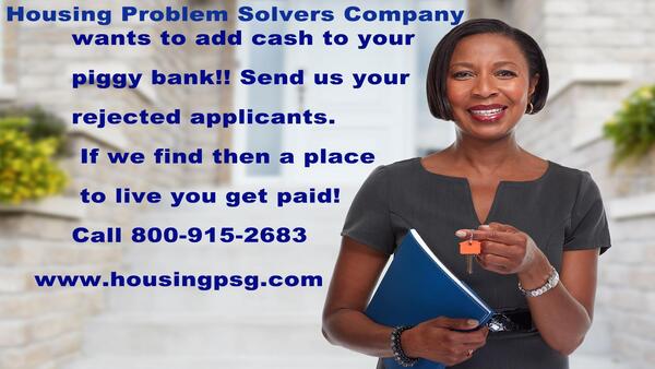 message housingpsg about this ad The Housing Problem Solvers Company will pay cash for your rejected clients. If we find them a place to live, we pay you. Call 800-915-2683. www.housingpsg.com |