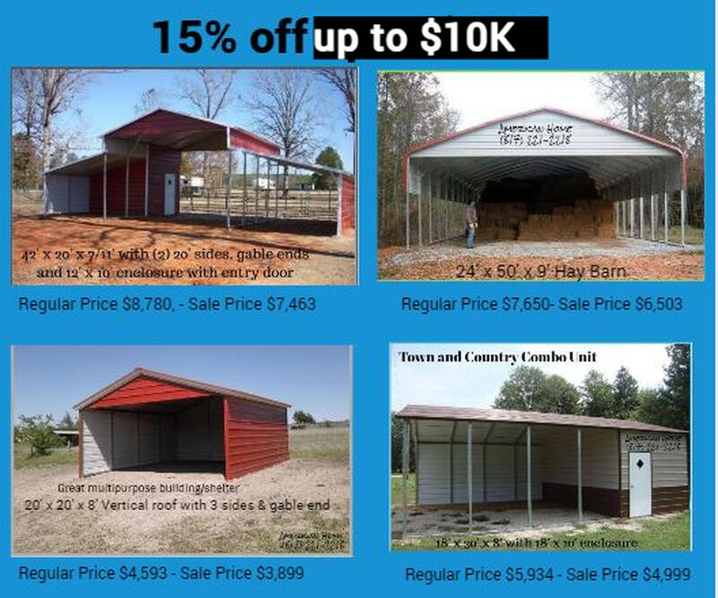 message americanhome1 about this ad Let us help you design your barn, shop, garage, loafing shed, RVPort, etc. Call our office today @ (817) 221-2218 for a free quote or visit our Facebook page at American Home Texas to see examples of our various projects. You can also email us at [email protected]. We currently have up to 35% off until November 30, 2025and also offer traditional financing and RTO financing. |