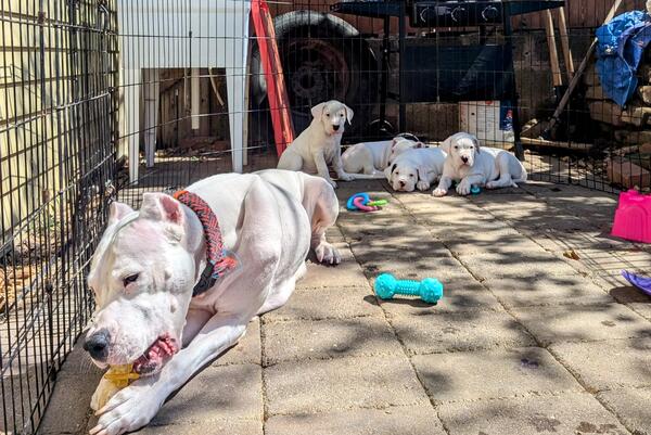 message fuerzadedios about this ad Niko De Los Polleo x Hinata De La Fuerza De Dios 4 pups 2 male 2 female. Pups will be AKC registered, dewormed, vaccinated, as well as microchipping and ear cropping. Parents are both embarked. Cleared for breeding and are 100% Dogo Argentino. 2-year health guarantee. Breeding the best Dogos in the East Coast! Just compare! Our Dogos are big boned and to standard of the breed. |