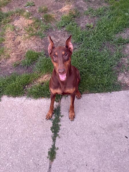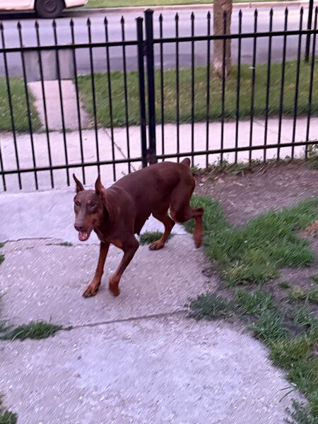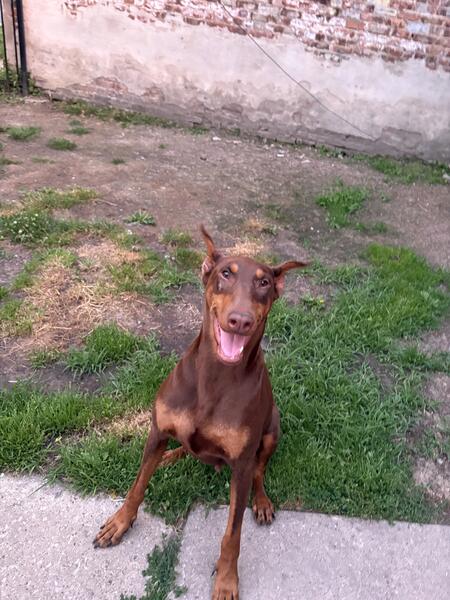 Red female doberman . Borned July 9 2020. Looking for new home. She comes with AKC papers