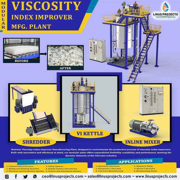 message smldnl2080 about this ad Introducing our Modular Viscosity Index Improver Manufacturing Plant, designed to revolutionize the production process of viscosity index improvers. Built with innovation and efficiency in mind, our modular plant offers unparalleled flexibility, scalability, and performance, meeting the dynamic demands of the lubricant industry. This is use in Lubricant Blending Plant. At the core of our plant is a modular design that allows for seamless integration of various components, including reactors, mixers, distillation units, and filtration systems. This modular approach enables rapid deployment, easy customization, and hassle-free expansion, ensuring optimal adaptability to changing production requirements and market demands. Our plant is equipped with advanced process automation and control systems, leveraging cutting-edge technology to optimize production efficiency and product quality. From raw material handling to final product packaging, every step of the manufacturing process is meticulously monitored and controlled to ensure consistency and reliability. with a focus on sustainability, our modular plant incorporates energy-efficient technologies and waste minimization strategies, minimizing environmental impact while maximizing resource utilization. Additionally, our plant adheres to stringent quality standards and regulatory requirements, ensuring that every batch of viscosity index improver meets the highest quality specifications. Whether youre a small-scale manufacturer looking to enter the viscosity index improver market or a large-scale producer seeking to enhance your production capabilities, our Modular Viscosity Index Improver Manufacturing Plant offers the perfect solution. Experience unmatched efficiency, flexibility, and reliability with our innovative modular plant, driving your success in the lubricant industry forward. LINUS PROJECTS (INDIA) specialized in Manufacturing Lubricant Plant Modular Viscosity Index Improver Mfg Plant and machinery on a Turnkey basis. We supply machines all around the Globe, at a very competitive price. message smldnl2080 about this ad |