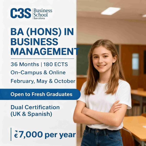 message samc3s about this ad Have you ever imagined studying in a city where world-class business opportunities meet sunny beaches, vibrant culture, and an international lifestyle? Thats exactly what you get when you choose Barcelona for your Business Management degree. At C3S Business School, we believe education is more than books and lecturesits about experiences, connections, and preparing you for a successful global career. And Barcelona is the perfect stage to make that happen. Why Barcelona is Every Students Dream for Business Studies International Vibes Walk into a classroom and meet students from every corner of the globe. Youll build friendships and networks that will last a lifetime. Business at Your Doorstep From global companies to innovative startups, Barcelona is a city buzzing with opportunities for internships, projects, and jobs. Perfect Lifestyle Imagine attending your morning lecture, then heading to the beach in the afternoon, or exploring Gauds stunning architecture over the weekend. Gateway to Europe Being in Barcelona puts you right in the middle of Europe, with endless opportunities to travel, explore, and expand your professional network. What Makes Business Management at C3S Special? At C3S Business School, our Business Management programs are designed to prepare you for real challenges. We dont just teach theoryyoull work on projects, dive into case studies, and gain hands-on experience that employers value. Heres what students love about our programs: Globally recognised European qualifications. Industry-focused curriculum designed for todays business world. Small class sizes that make learning personal and interactive. Career support to help you land internships and job placements. A multicultural environment that helps you grow personally and professionally. Career Opportunities Waiting for You Studying Business Management in Barcelona opens doors to exciting roles such as: Business Consultant Marketing Manager HR Specialist Entrepreneur or Startup Founder International Trade Expert The citys strong business ecosystem ensures youre not just studyingyoure stepping right into a world full of career possibilities. Life as a C3S Student in Barcelona Picture this: Youre in class learning about international marketing in the morning, grabbing tapas with friends in the afternoon, and attending a networking event at a tech startup in the evening. Thats life at C3S Business Schoola mix of learning, fun, and career-building. With support services like visa guidance, career counseling, and internship opportunities, we make sure your study abroad journey is smooth and rewarding. Final Thoughts If youre looking for a place where education meets adventure, culture, and career growth, then studying Business Management in Barcelona at C3S Business School is your perfect choice. Here, you wont just earn a degreeyoull discover yourself, make lifelong connections, and create a future full of opportunities. Ready to take the first step? Explore Business Management programs at C3S Business School and start your Barcelona journey today. message samc3s about this ad |