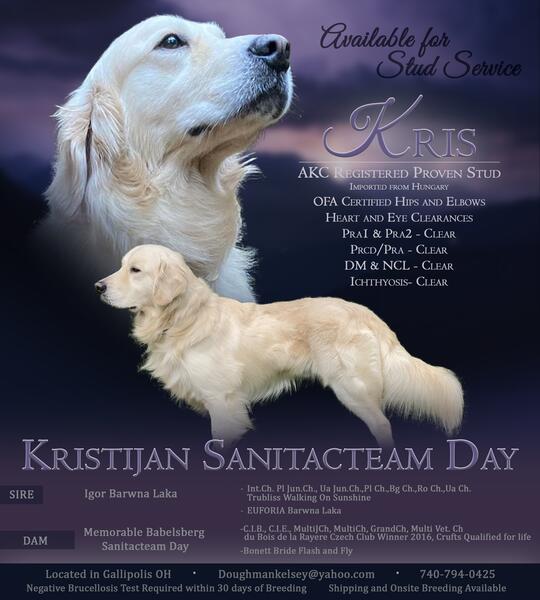 message ksqtrhorses about this ad Kris is AKC registered, he is OFA certified for Hips, Elbows, heart and eyes and he is genetically clear. He has champion bloodlines. Stud service is available onsite or shipping is available. $1000 female must have negative brucellosis test within 30 days prior to breeding. Located in Gallipolis Ohio. $1000 stud fee 740-794-0425 |