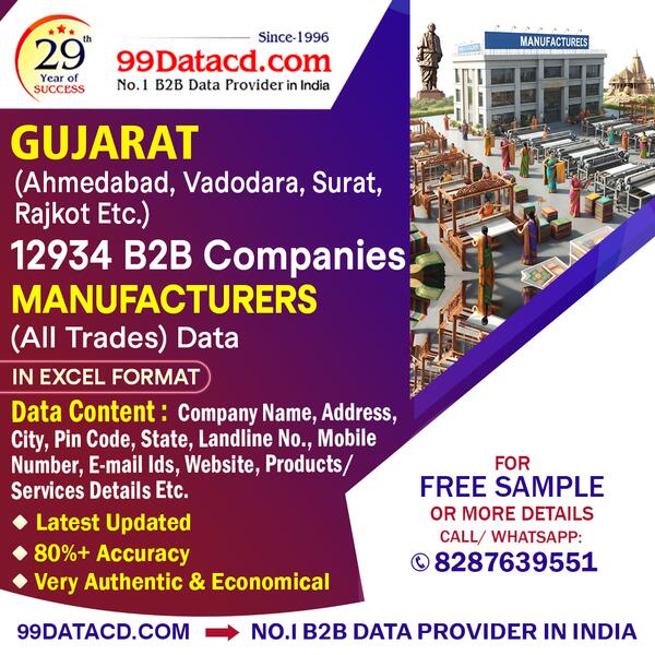 message dataprovider about this ad Are you looking for a Gujarat manufacturing company list to grow your business efficiently? Look no further! Buy an updated list of Gujarat manufacturing companies from 99Datacd a trusted B2B database service provider company.Get 12934 Gujarat (Ahmedabad, Vadodara, Surat, Rajkot Etc Manufacturers (All Trades) Data - In Excel Format. Our Data is Useful for Calling, Whatsapp Marketing, E-mailing, Bulk SMS, for Any Business / Industry / Trade For your Business Growth. The exclusive data is available in the Excel format on the website. With just one click, you can pay and download the exclusive data. Get a flat 30% discount! Don't miss our super discount offer. Hurry Up! For more info, call our experts Call/Whatsapp: 8287639551 Email ID: sales@99datacd.com Address: 206, RG Trade Tower, Netaji Subhash Place, Delhi - 110034, India Website: |