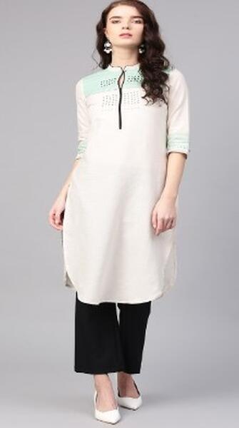 message prerana about this ad Product Code: 8429437 Off-White and turquoise blue yoke design straight kurta, has a keyhole neck, three-quarter sleeves, curved hem, side slits The model (height 5'8 is wearing a size S Show off your elegant style with a brand new kurta from W. For your next dinner party or family gathering, this off-white piece pairs well with dark leggings and chic flats. 88% cotton, 12% flax Hand-wash httpsmyntr.it/AqYVhbr |