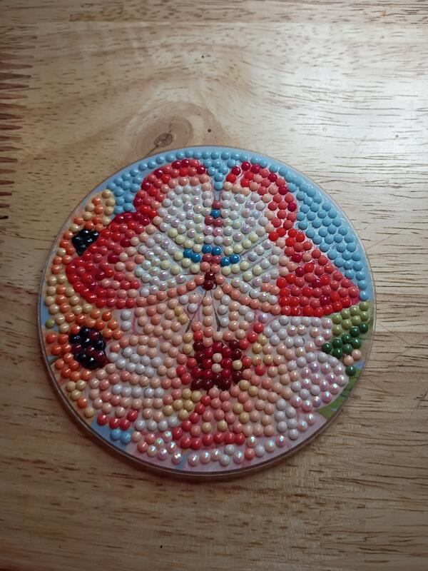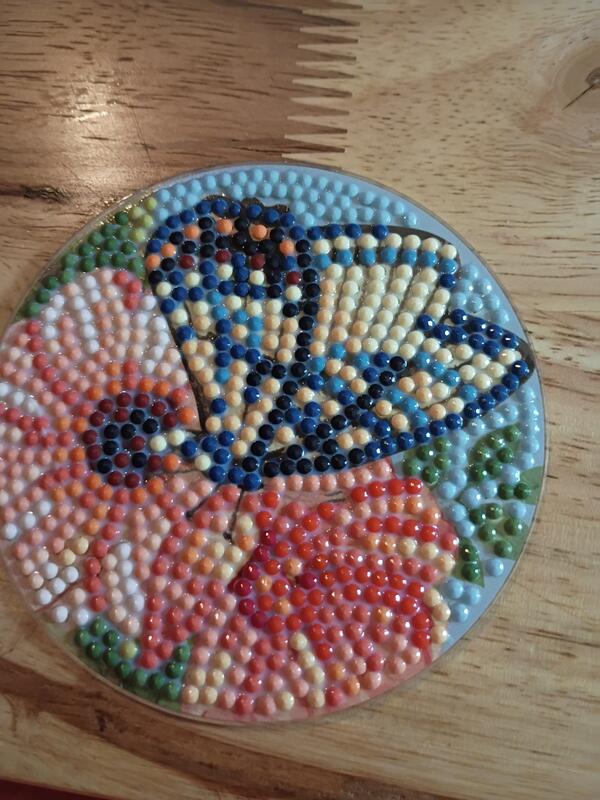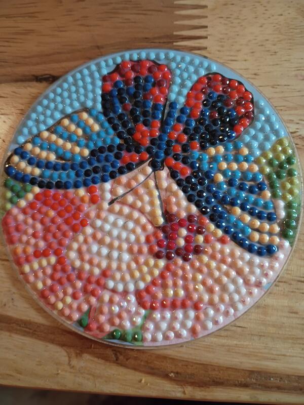 Diamond painting butterfly coasters. They are rolled and set and have a cork backing. Asking $20