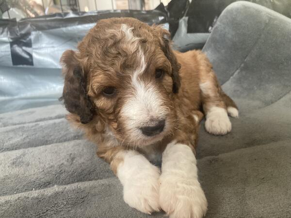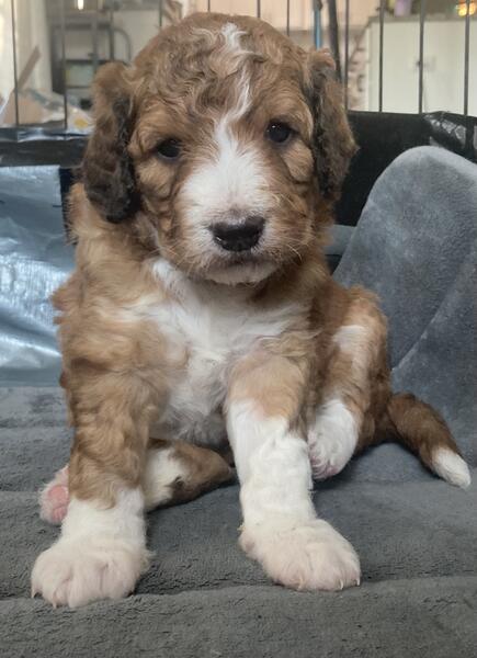message ahilse about this ad One tri-color female and one male with possible blue eyes available. $1800 for male. $2000 for female. Comes dewormed, first round of shots, and socialized around children, and other dogs. Will be ready for homes September 27th. Mom is full blooded standard poodle. Dad is 1st generation Aussiedoodle. Both are 33-40 lbs. Puppies should average that size as well. These puppies will not shed being F1Bs. Will not ship. Must do an interview with breeder, and place a deposit to hold a puppy. Must pick up within a 75 miles radius of 42701 Text 2seven0sevensixsix7five8four |