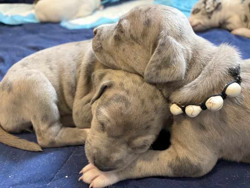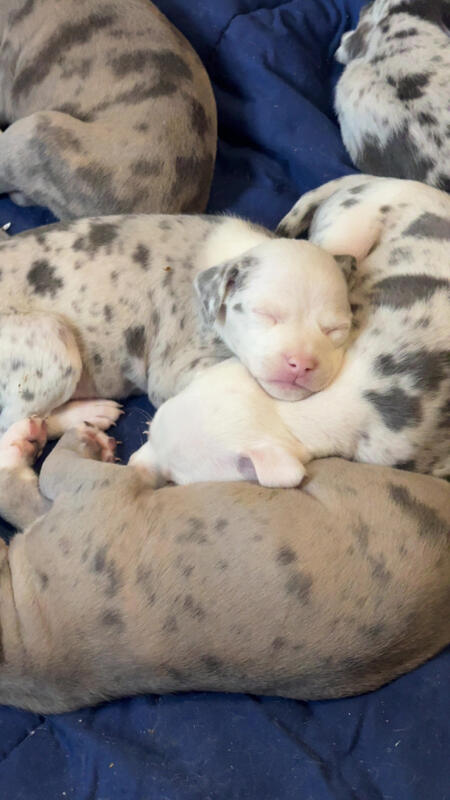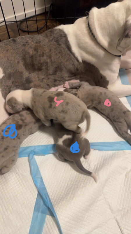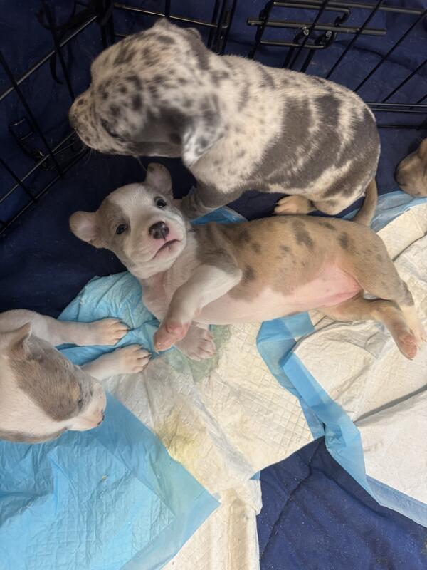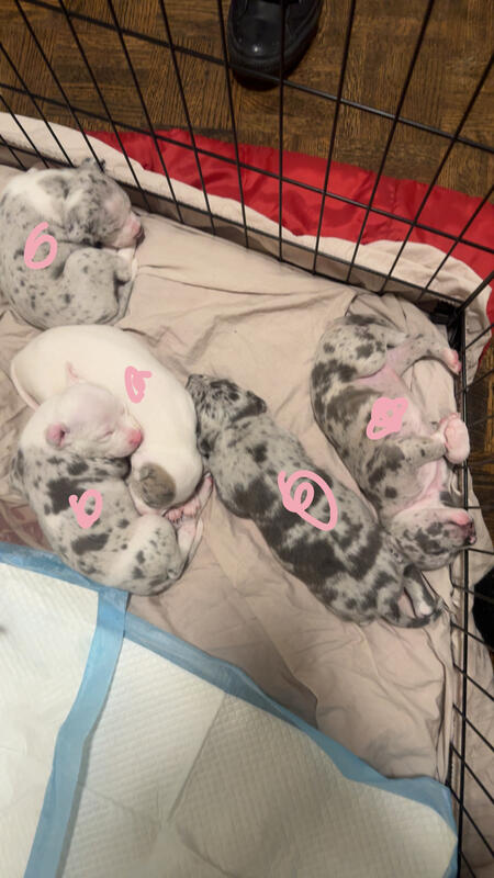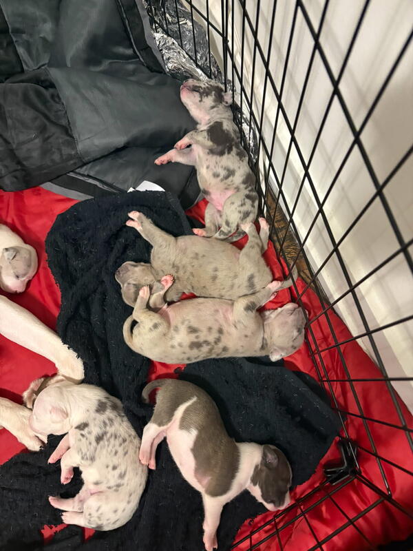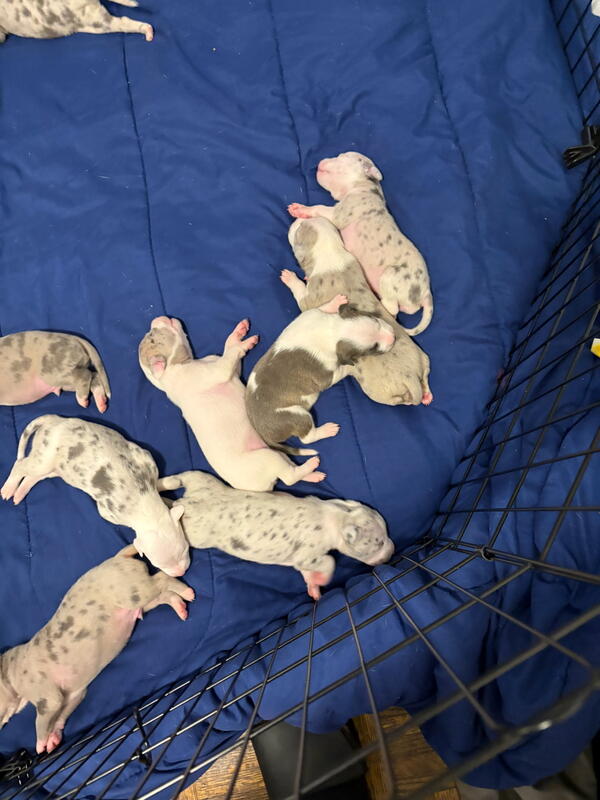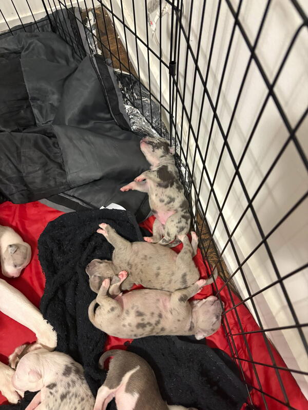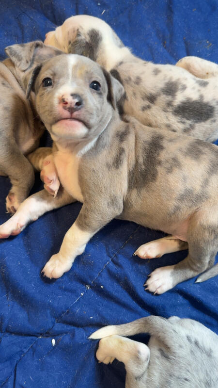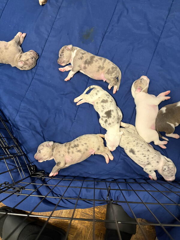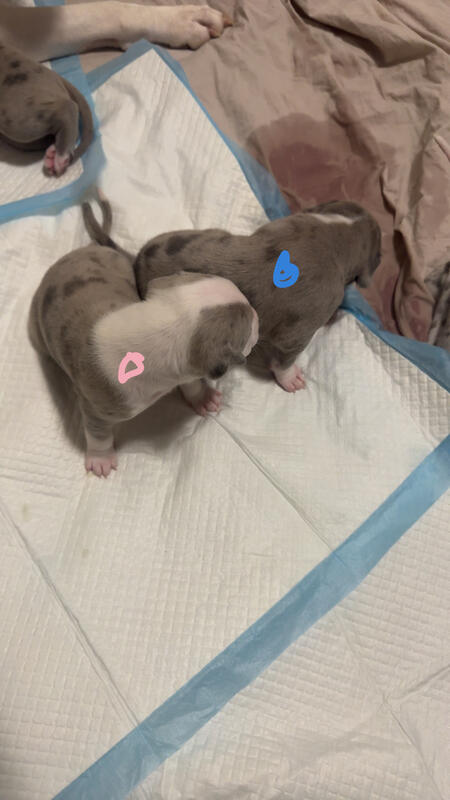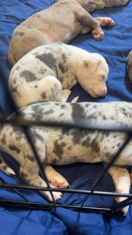 message offseason about this ad Pure Blood American Bullies 8 girls 2 boys Will come with 1st shots and dewormed Pee pad trained Puppy starter kit available upon request (Extra fee) 9 Merles and 1 Brindle Mother is Merle Father is brindle Puppies will be ready to go Jan 6 2026 |