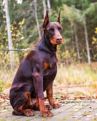 Basically trained red (brown) and tan (rust) European Doberman Pincher female puppy