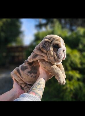 Rare colored English Bulldog puppies. Born January 5,2025 1 blue fawn merle male available Vet hea...