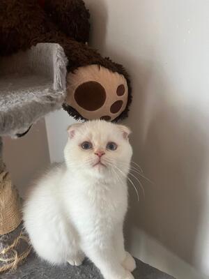 Pure bred Scottish Fold kitten. 7 months old. White coat with blue eyes. He’s had his first set of...