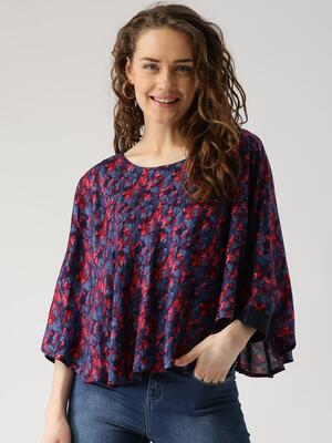 Product Code: 1731802 Blue and red woven floral print cape top, has a round neck, three-quarter s...