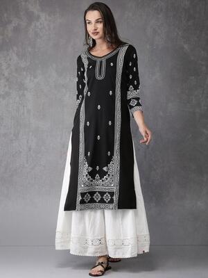 Product Code: 2322907 Black and white printed straight kurta, has a round neck, three-quarter s...