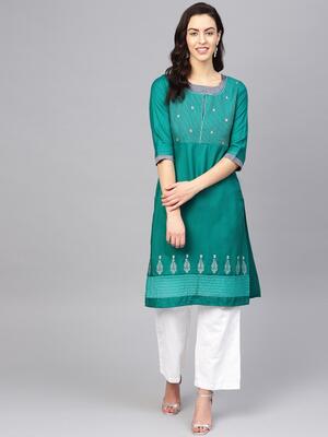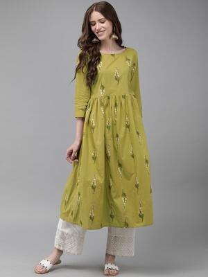 Product Code: 11197970 Green printed A-line kurta, has a round neck, three-quarter sleeves, and f...