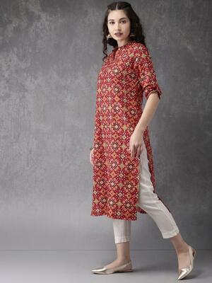 Product Code: 9186553 Red printed A-line fusion kurta, has a round neck, three-quarter sleeves, f...