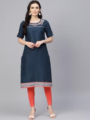 Product Code: 8429165 Navy Blue solid straight kurta , has a round neck with embroidered detail, ...