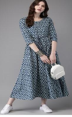 Product Code: 10297751 Blue printed A-line kurta, has a round neck, three-quarter sleeves, and fl...