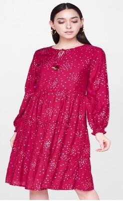 Product Code: 10866266 Pink with a tinge of maroon printed fit and flare dress, has a round neck, b...