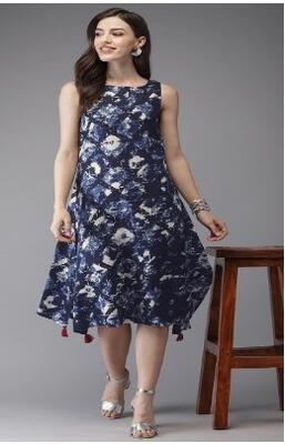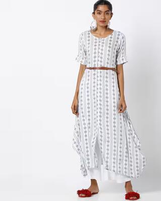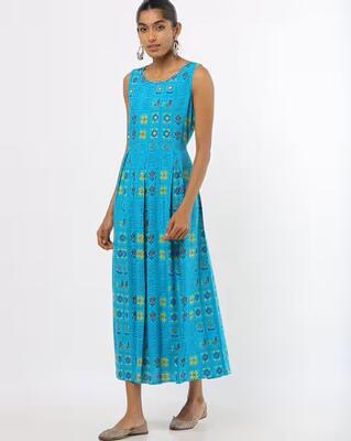Product Code: 10297777 Blue and white printed A-line fusion kurta, has a round neck, sleeveless, ...