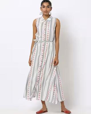 Striped Maxi Shirt Dress with Waist Tie-Up