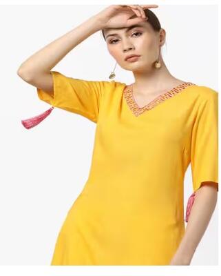 Embroidered V-neck Straight Kurta with Tassels