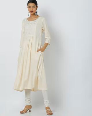 Product Code: 10206885 Green and silver yoke-design straight kurta with embroidered detail, has a...