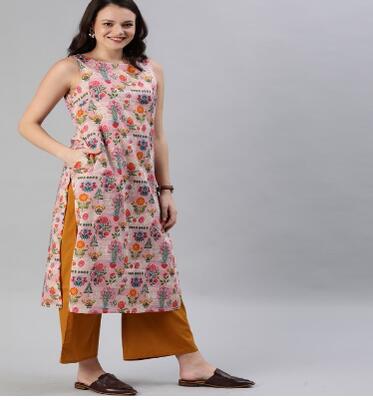 Product Code: 10959710 Pink and Mustard printed straight kurta, has a round neck, sleeveless, str...