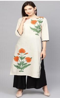 Product Code: 9626007 Off-White and Orange printed straight kurta with thread work detail, has a ...