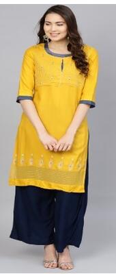Product Code: 9625857 Orange and navy blue solid kurta with palazzos Orange solid straight cal...