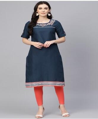 Product Code: 8429165 Navy Blue solid straight kurta , has a round neck with embroidered detail, sho...