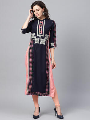 Product Code: 9626023 Navy Blue and pink printed straight kurta, has a mandarin collar, three-qua...