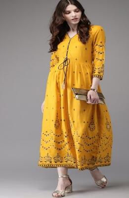 Product Code: 9186557 Yellow and Navy Blue printed anarkali kurta, has a V-neck, three-quarter sl...