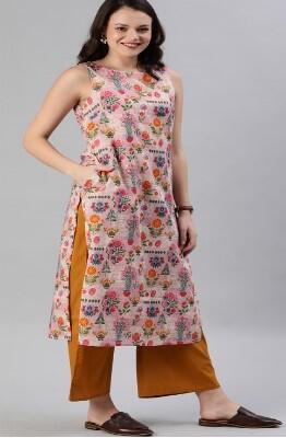 Product Code: 10959710 Pink and Mustard printed straight kurta, has a round neck, sleeveless, str...