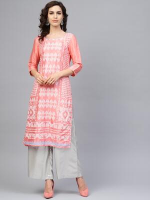 Product Code: 10129025 Pink and White printed straight kurta, has a round neck, three-quarter s...