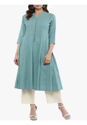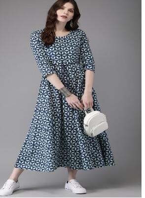 Product Code: 10297751 Blue printed A-line kurta, has a round neck, three-quarter sleeves, and fl...