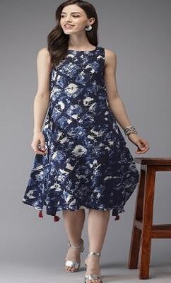 Product Code: 10297777 Blue and white printed A-line fusion kurta, has a round neck, sleeveless, ...