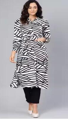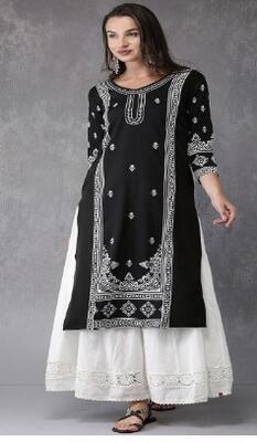 Product Code: 2322907 Black and white printed straight kurta, has a round neck, three-quarter sle...