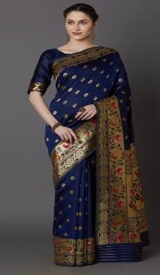 Product Code: 10430788 Design Detail: Navy Blue banarasi woven design saree and has a zari border ...