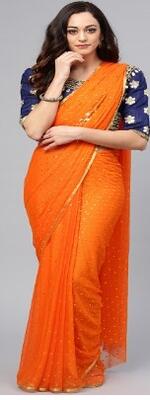 Product Code: 7999577 Design Detail: Orange and navy blue embellished saree, has a solid border C...