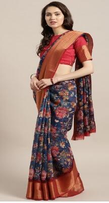 Saree mall Navy Blue & Red Linen Blend Printed Saree