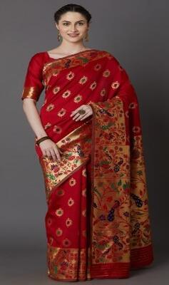 Mitera Red Silk Blend Woven Design Banarasi Saree