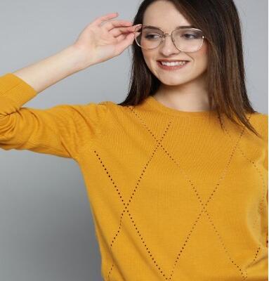 Product Code: 9696155 Mustard yellow self-design sweater, has a round neck, long sleeves, and rib...