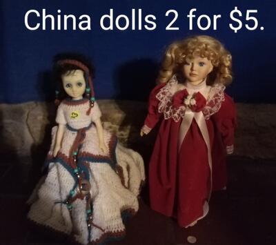 Dolls are with the stand. Box of tins are all different sizes and shapes. Prices are marked on the p...