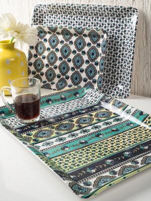 GOODHOMES Set of 3 White & Navy Blue Printed Rectangular Melamine Serving Trays