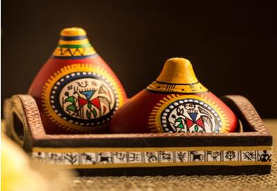 ExclusiveLane Red Terracotta Warli Hand-Painted Salt & Pepper Shaker With Tray