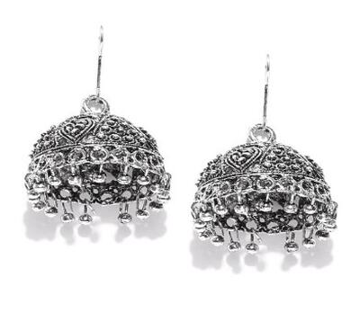 Product Code: 2231510 Oxidised silver-plated textured dome shaped jhumkas Secured with a fish-...
