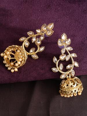 Priyaasi Gold-Plated Kundan Studded Leaf Shaped Drop Earrings