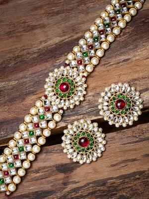 Zaveri Pearls Red & Green Gold-Plated Jewellery Set