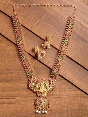 Zaveri Pearls Gold-Plated Red & Green Stone-Studded Goddess Laxmi Temple Jewellery Set